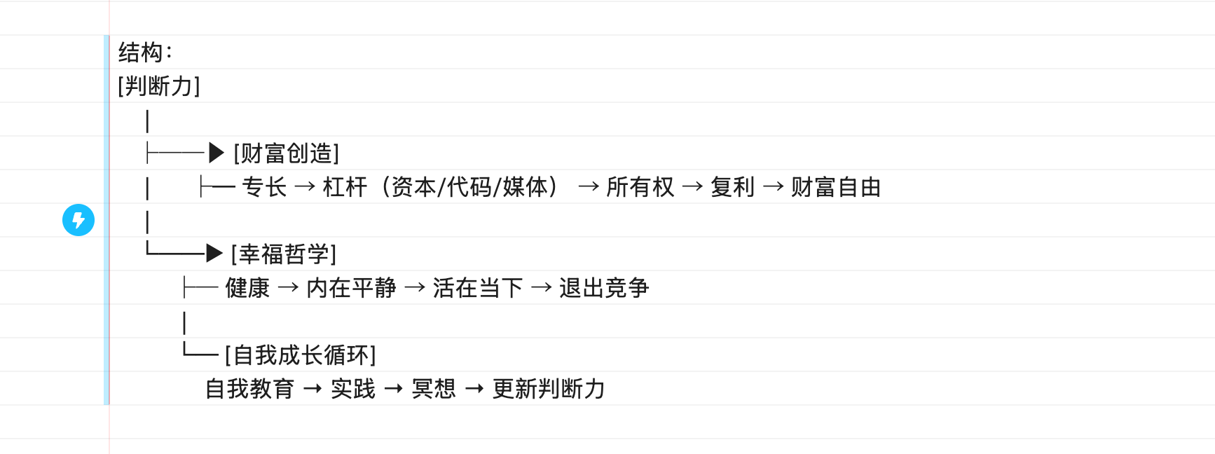 │ ├─ 专长 → 杠杆(资本/代码/媒体) → 所有权 → 复利 → 财富自由