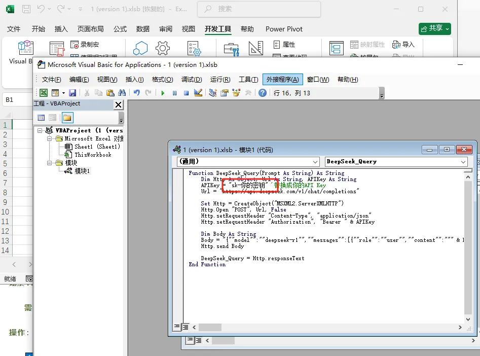 - 保存并关闭编辑器 → 返回Excel即可调用=DeepSeek_Query(A1)函数