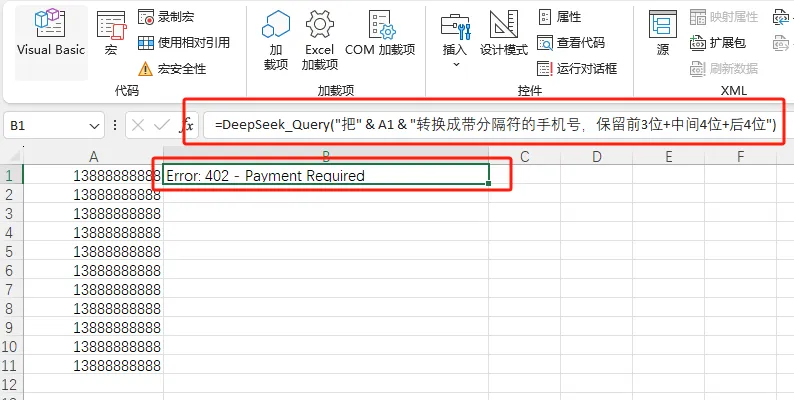 =DeepSeek_Query("把" & A1 & "转换成带分隔符的手机号,保留前3位+中间4位+后4位")