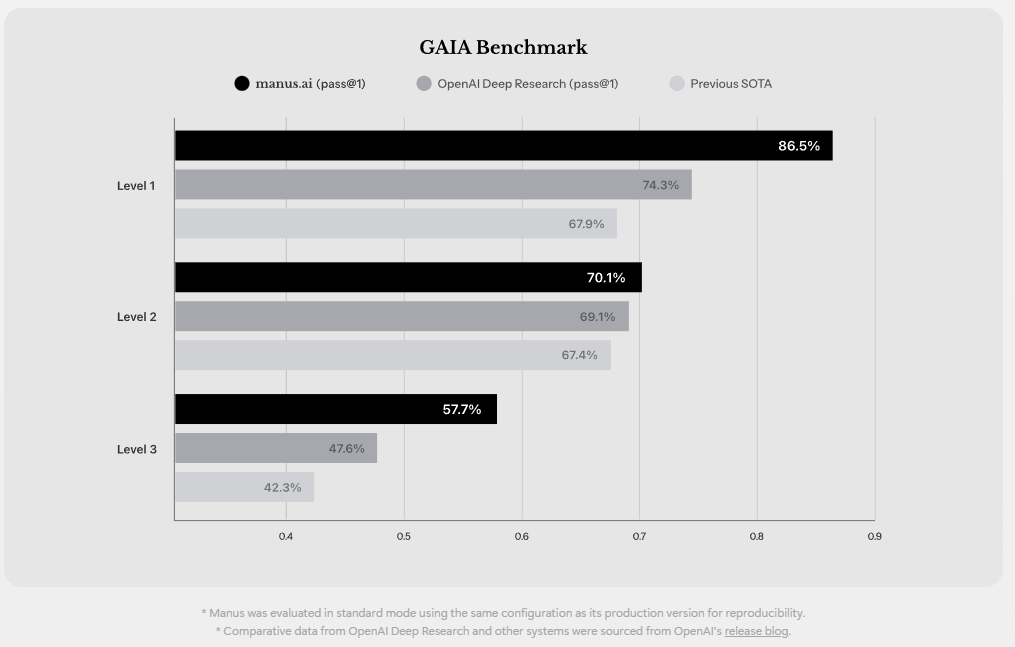 - GAIA是一个用于评测通用Al助手的基准测试,衡量它们在不同难度级别(Level1、Level2、Level3)的表现。Manus Al在所有三个 难度级别上都取得了最新的SOTA结果。