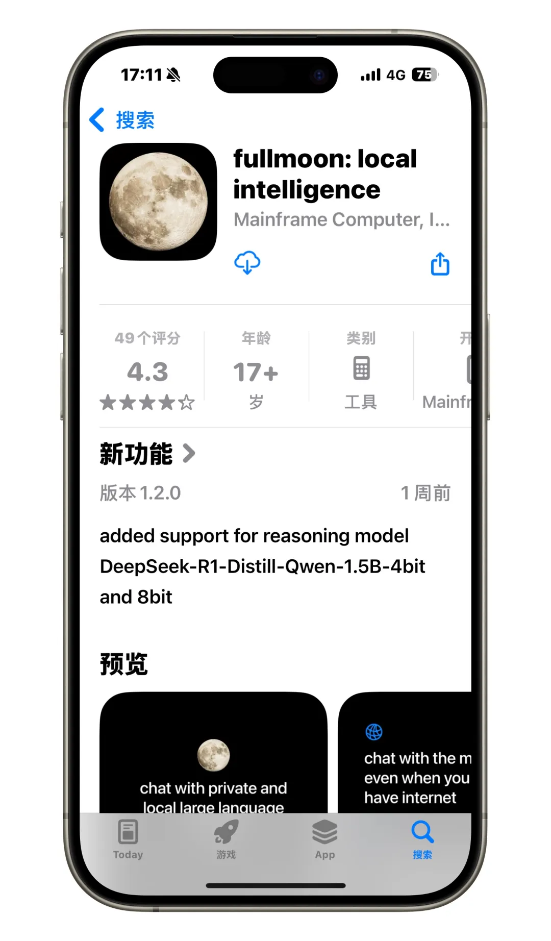 在 iPhone 和 iPad 本地安装和使用 DeepSeek R1 也很简单,先在 App Store(国区也可)下载「fullmoon」这款免费 App。