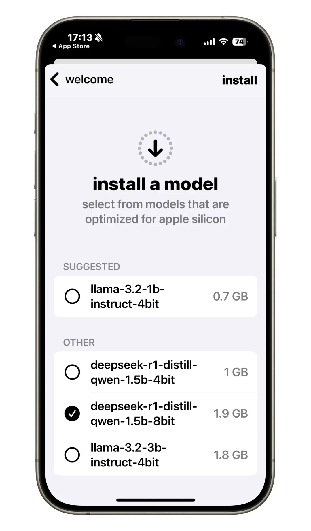 下载好打开,就会先提示你安装第一个本地大模型,不过只有 1.5b 的两个蒸馏,更大了手机怕是也跑不动。选 1.9GB 的那个 deepseed-r1-1.5b-8bit 并点右上角 install 来下载。