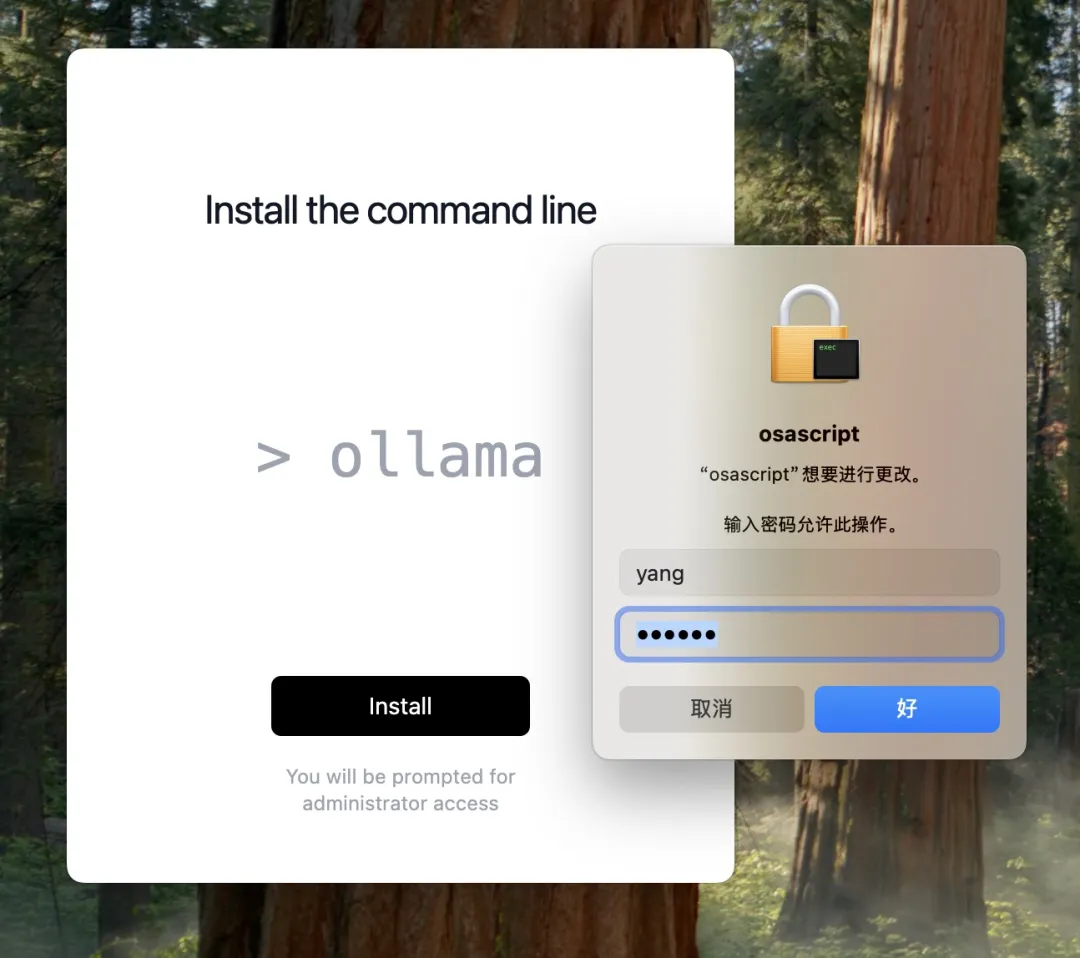 第一次打开 Ollama,点黑色 Install 按钮,然后输入你的 Mac 用户密码授权就可以关闭 Ollama 窗口了。