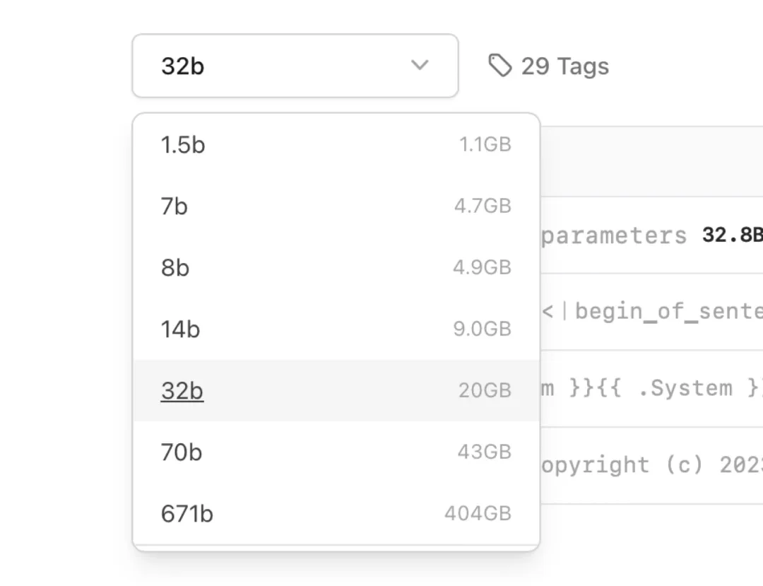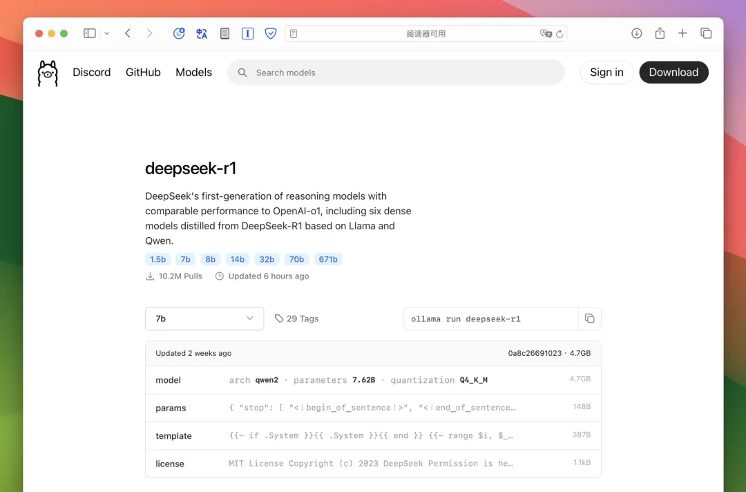 选择想要跑的蒸馏模型(Distilled models),比如 7b、32b,后面会显示这个模型的大小。模型越大,表现越好,但对电脑的性能(尤其是大内存)的要求也越高,总之按照自己的电脑配置选择。