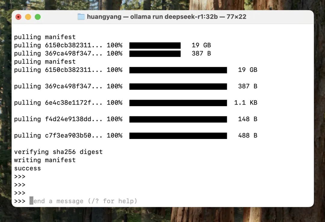 显示 success 就表示这个本地大模型下载完成了,直接输入文本和它对话了。